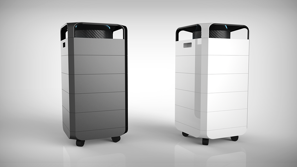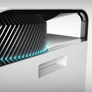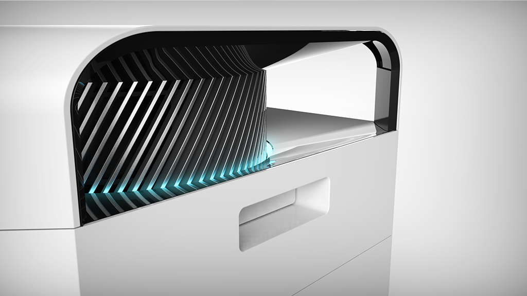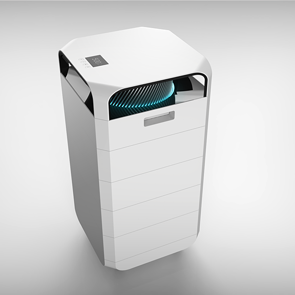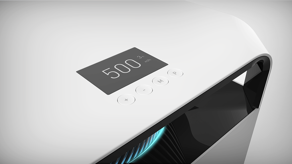 該產(chǎn)品底部進(jìn)風(fēng),風(fēng)機(jī)置頂,空氣流經(jīng)層層濾網(wǎng),由頂部的風(fēng)機(jī)將潔凈的空氣向四個(gè)方向噴出,合理的結(jié)構(gòu)保證了盡可能大的濾網(wǎng)有效橫截面積,減少空氣流經(jīng)路徑的轉(zhuǎn)向?qū)艋芰淼挠绊?。另外空氣凈化器提供了四層位置安裝濾網(wǎng),可靈活自定義,根據(jù)自身需求靈活選擇濾網(wǎng)組合。同時(shí)還創(chuàng)新性地提供了多款專效濾網(wǎng),針對甲醛、細(xì)菌、煙味等,專注于解決不同使用環(huán)境中用戶的痛點(diǎn),滿足每一個(gè)用戶對潔凈空氣的需求。設(shè)計(jì)概念重點(diǎn)表現(xiàn)未來感及科技感,電機(jī)防護(hù)罩周圍的隱藏式燈帶可直觀的反映出室內(nèi)的空氣質(zhì)量情況,是整個(gè)設(shè)計(jì)的點(diǎn)睛之筆。設(shè)計(jì)語言在保持硬朗高效率寓意的前提下也進(jìn)行了去邊角處理,增加產(chǎn)品的友好性。色彩材質(zhì)方面以代表潔凈的白色為主色調(diào),電機(jī)罩部分以銀色寓意功能強(qiáng)大,中間以黑色進(jìn)行過度和增加對比。體現(xiàn)出外表極致簡潔,功能極其強(qiáng)大的核心理念。