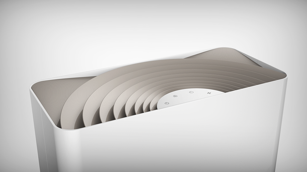 整體的設(shè)計(jì)概念大多取自自然的元素,增加了工業(yè)產(chǎn)品的人情味。材質(zhì)的選用和搭配簡(jiǎn)潔明了,不突兀,更容易融入各種使用環(huán)境。出風(fēng)口的設(shè)計(jì)抽象于安靜水面上泛起的一絲漣漪,擴(kuò)散的語(yǔ)言也符合出風(fēng)的寓意。機(jī)器背面的進(jìn)風(fēng)口的設(shè)計(jì)在符合整體有機(jī)、自然的風(fēng)格下也加強(qiáng)了進(jìn)風(fēng)的產(chǎn)品語(yǔ)義。整體設(shè)計(jì)在平面的外表下又具備一些充滿靈氣的細(xì)節(jié)。